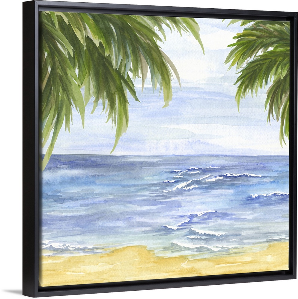 <p>A contemporary painting of calm waves on a beach framed by palm trees.</p>