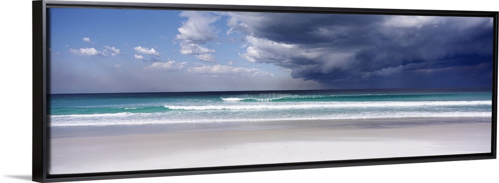 <p>Panoramic photo print of an ocean with crashing waves and blue skies on the left and storm clouds on the right.</p>