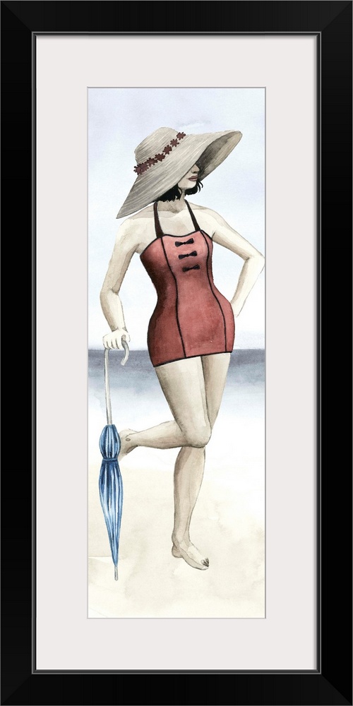 <p>Watercolor portrait of a beautiful woman wearing a large hat, posing on the beach.</p>