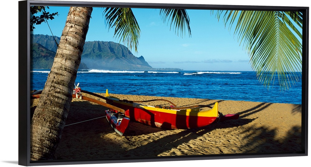 <p>Oversize wall art of a landscape photograph of a sailboat pulled up the shore and resting in the shade of a palm tree with ocean waves and mountains in the distance.</p>