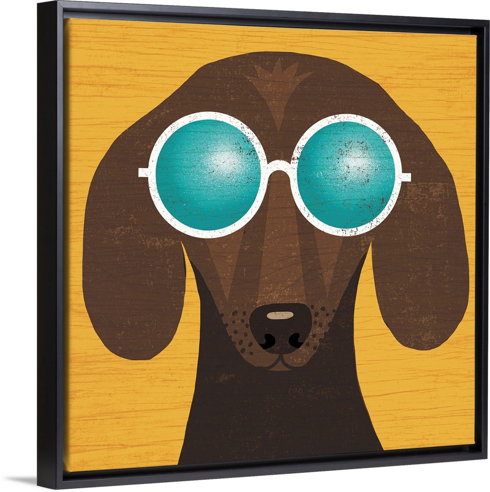 <p>Illustration of a dachshund wearing circular sunglasses on a yellow wood grain background.</p>