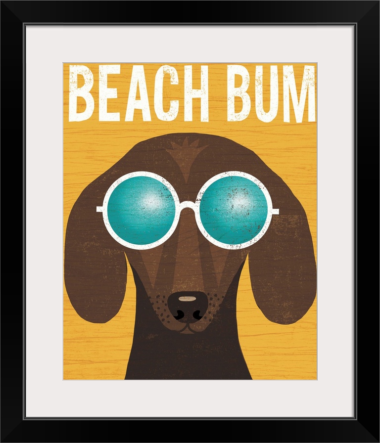 <p>Illustration of a dachshund wearing circular sunglasses on a yellow wood grain background with "Beach Bum" written at the top.</p>