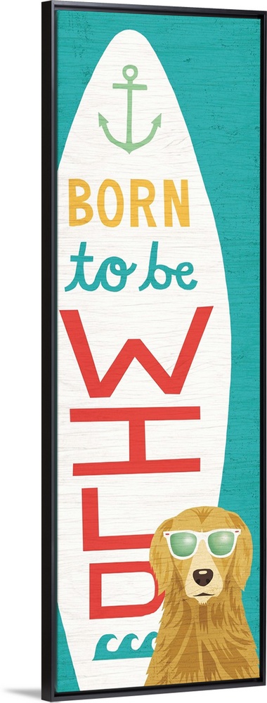 <p>"Born to Be Wild" surfboard decorated with an anchor and waves with a golden retriever in the foreground wearing sunglasses on a blue background.</p>