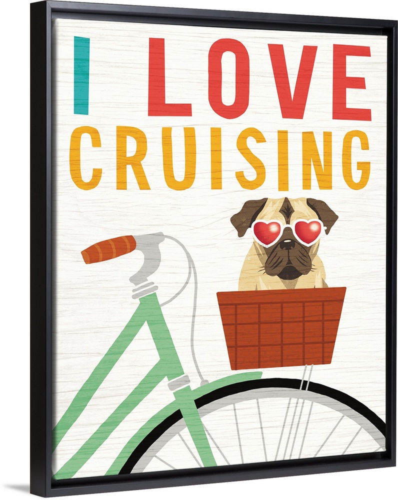 <p>"I Love Cruising" illustration of a pug in the basket of a bicycle wearing heart shaped sunglasses on a white wood grain background.</p>