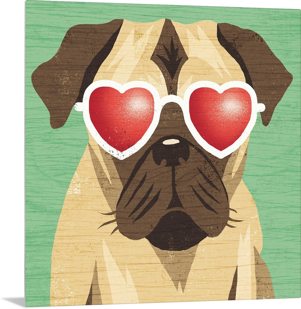 <p>Illustration of a pug wearing heart shaped sunglasses on a green wood grain background.</p>