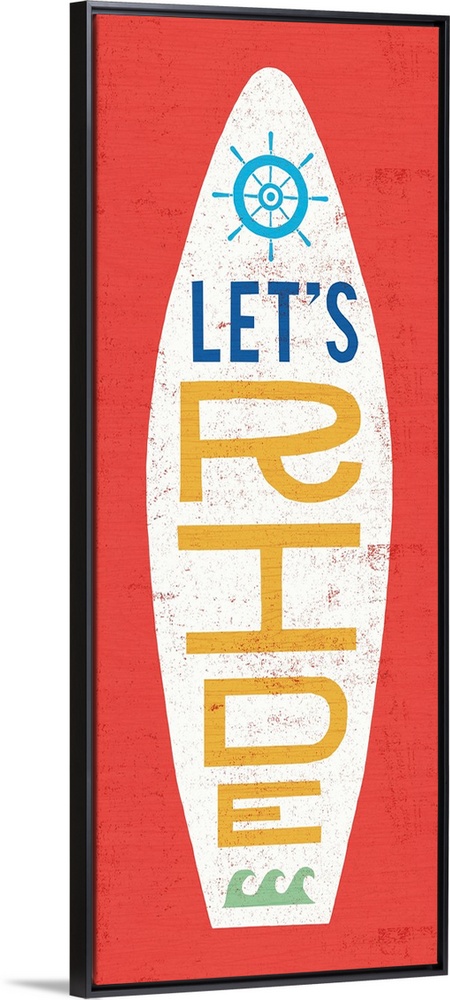 <p>"Let's Ride" surfboard decorated with waves and a helm on a red background.</p>