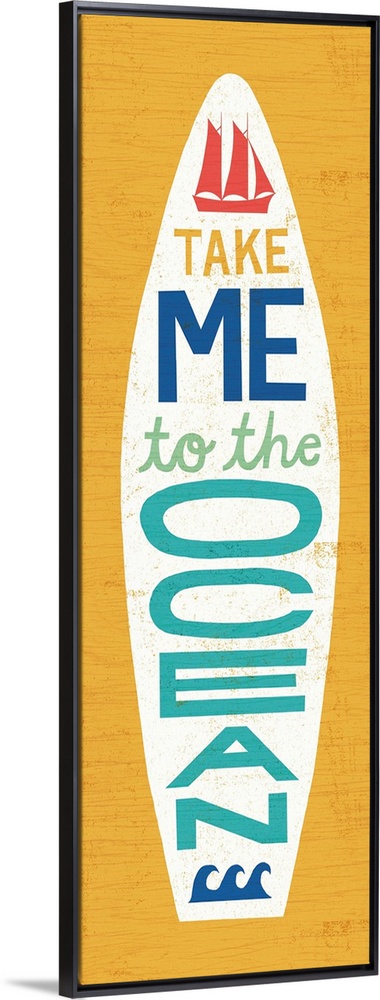 <p>"Take Me to the Ocean" surfboard decorated with a sailboat and waves on a yellow background.</p>