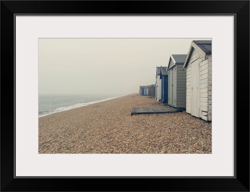 <p>A photograph of a pebbled beach with a row of beach huts on an overcast day.</p>