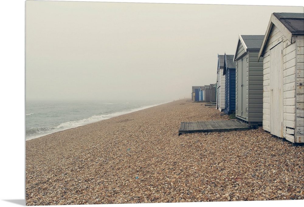 <p>A photograph of a pebbled beach with a row of beach huts on an overcast day.</p>