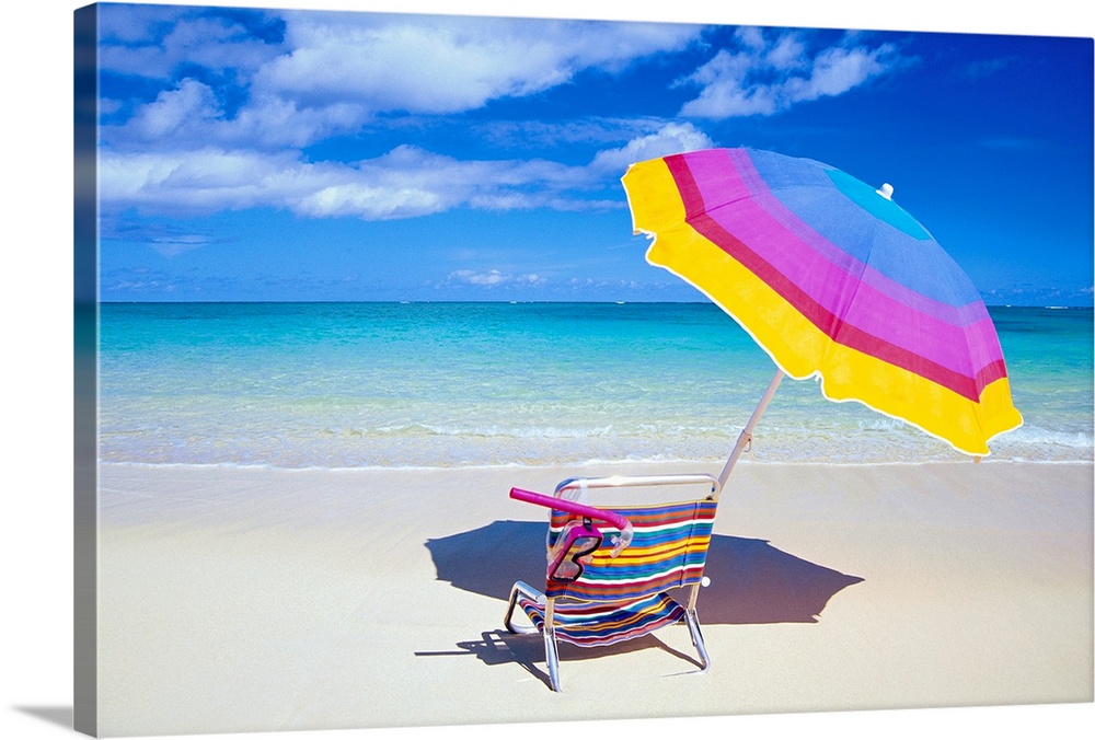 <p>A large photograph of a colorful beach chair and umbrella sitting solely on the sand close to the clear ocean water.</p>