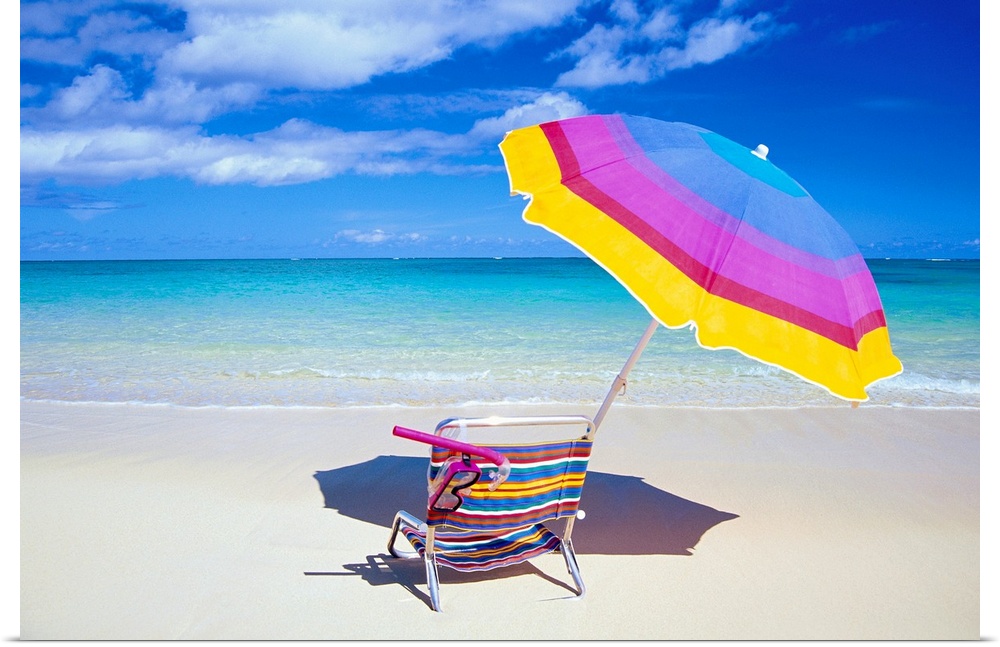 <p>A large photograph of a colorful beach chair and umbrella sitting solely on the sand close to the clear ocean water.</p>