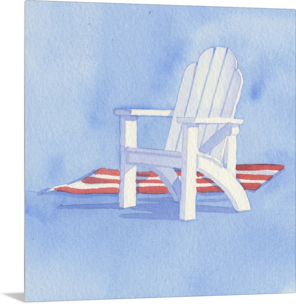 <p>Watercolor painting from a series of adirondack chairs with a beach towel.</p>