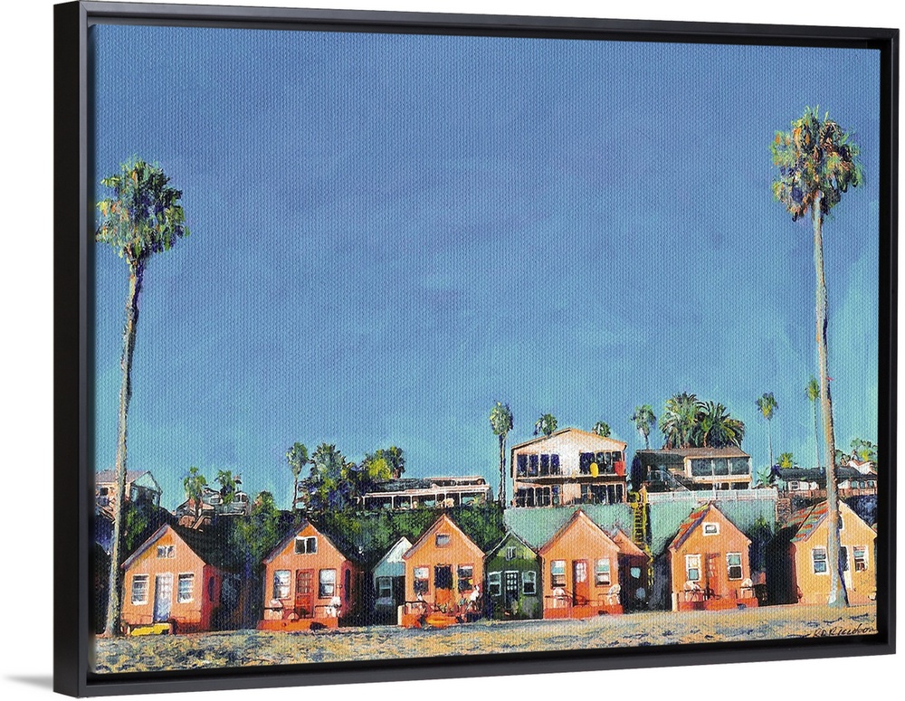 <p>Contemporary painting of a row of beach cottages with palm trees.</p>