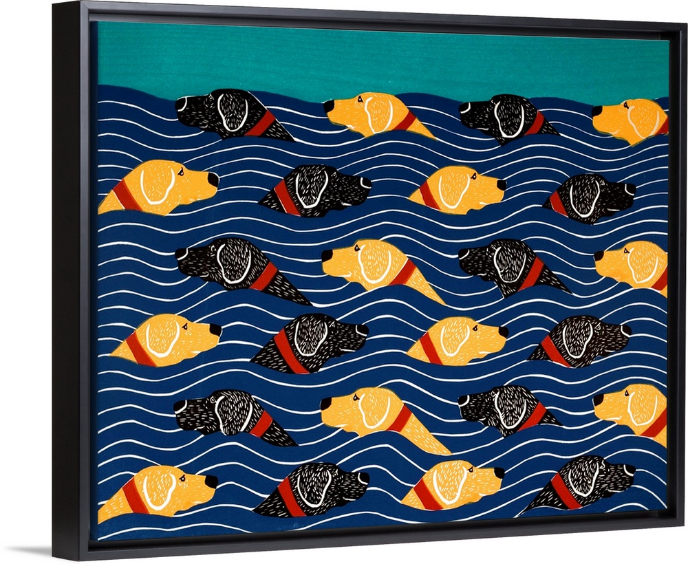 <p>Pattern of black and yellow labs swimming in the ocean waves in opposite directions.</p>