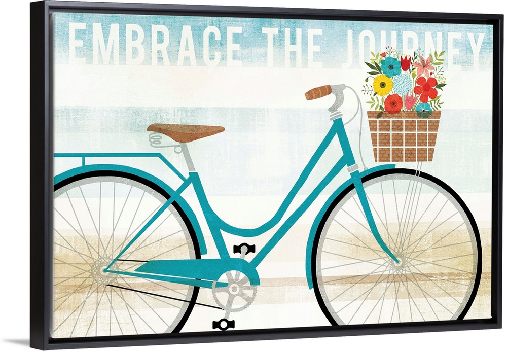 <p>"Embrace the Journey" with an illustration of a blue bicycle with a basket of flowers on a blue, white, and tan background created with horizontal lines.</p>