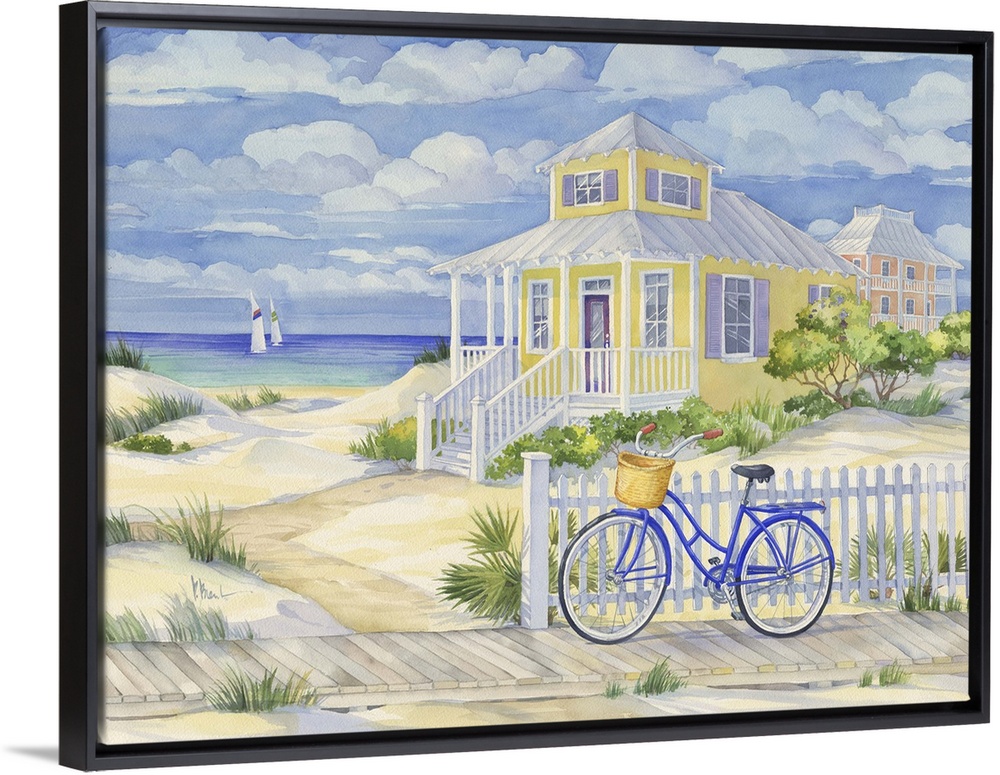 <p>Watercolor painting of a bicycle leaning against a fence near a beach house.</p>