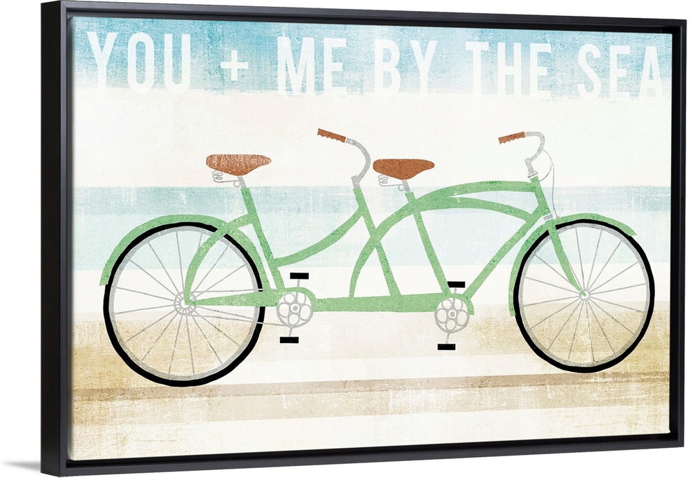 <p>"You Me By The Sea" with an illustration of a green tandem bicycle on a blue, white, and tan background created with horizontal lines.</p>