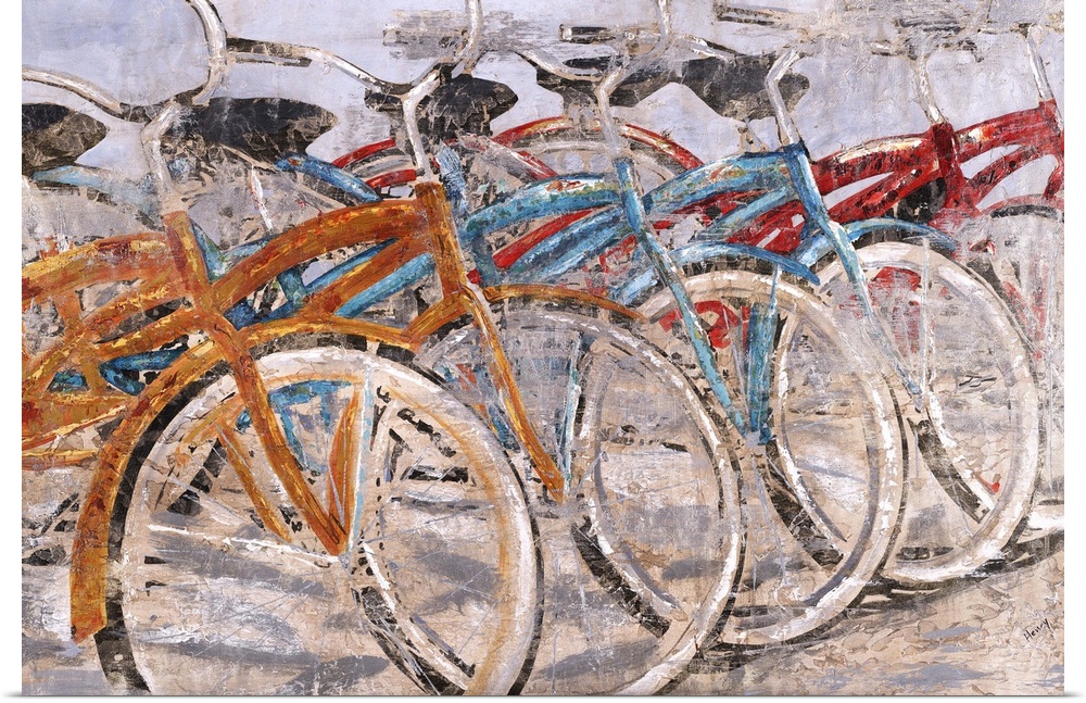 <p>Contemporary painting with orange, blue, and red bicycles parked in a line.</p>