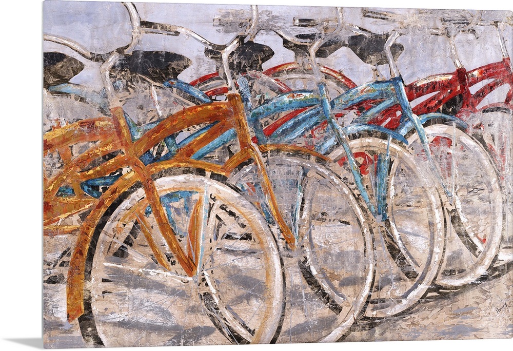 <p>Contemporary painting with orange, blue, and red bicycles parked in a line.</p>