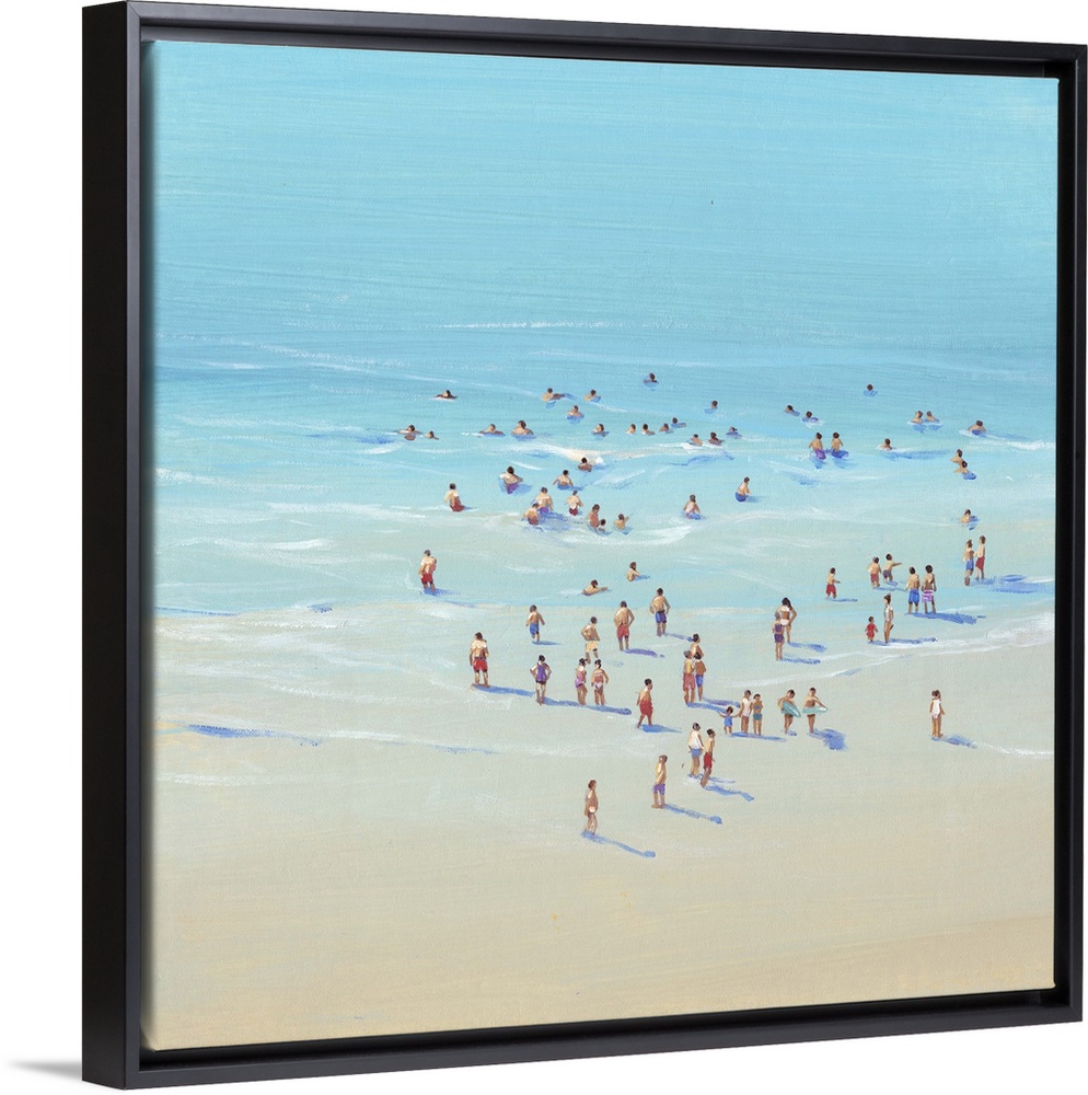 <p>Contemporary painting of an aerial view of people on a sandy beach.</p>
