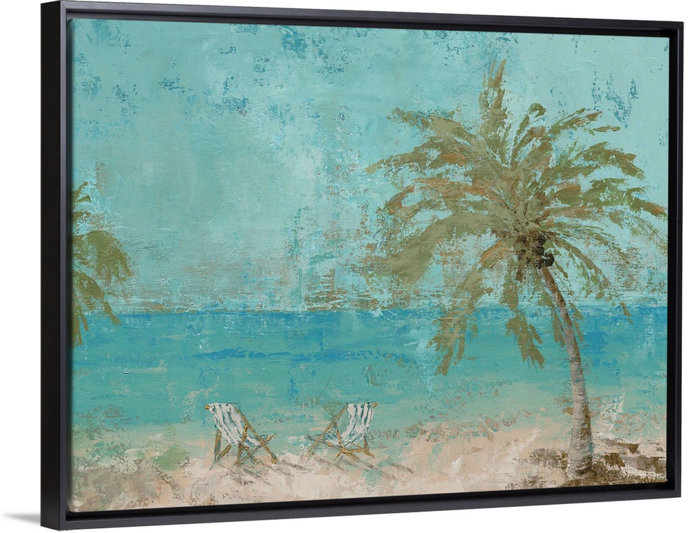 <p>A contemporary painting of lawn chairs next to palm trees on a beach with teal blue water.</p>