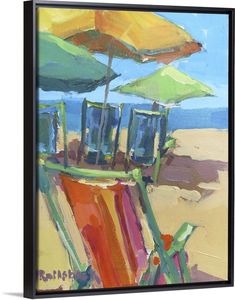 <p>A coastal themed painting of colorful chairs sitting on a beach.</p>