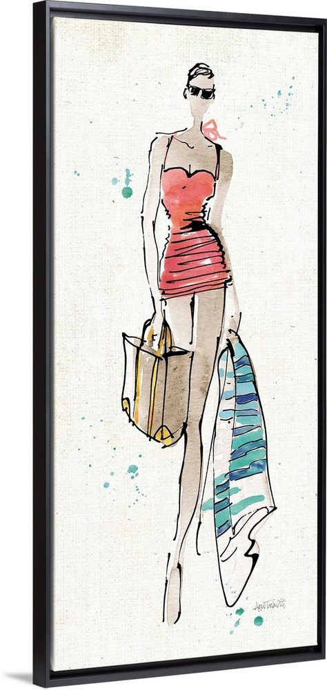 <p>Contemporary fashion sketch of a woman wearing beach attire.</p>