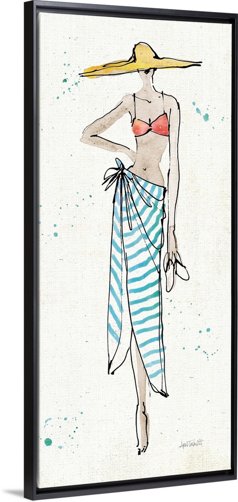 <p>Contemporary fashion sketch of a woman wearing beach attire.</p>