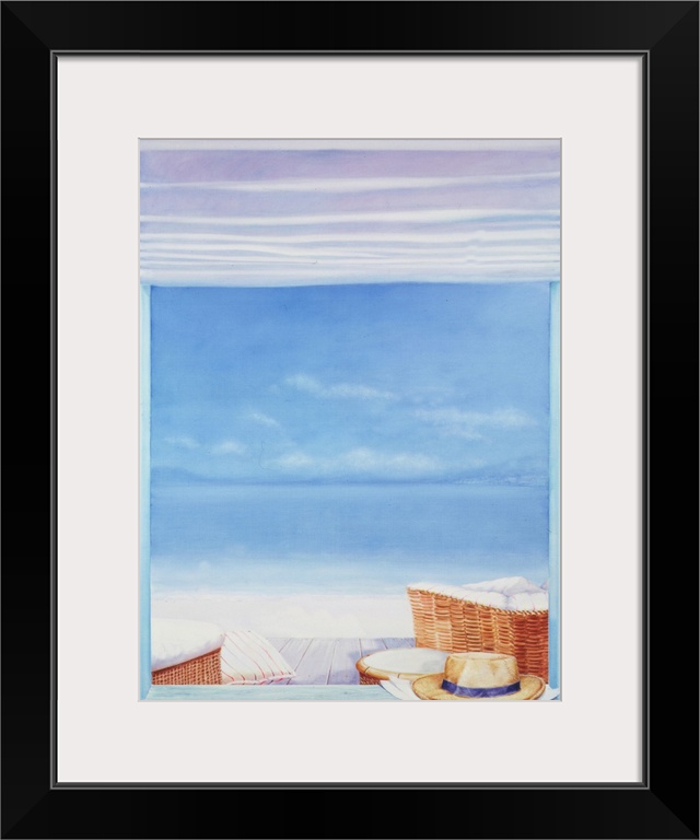 <p>Contemporary painting of a hat sitting on the window sill, overlooking the beach.</p>