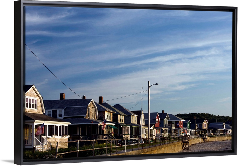 <p>USA, Massachusetts, Cape Ann, Rockport, Long Beach beachhouses, sunrise</p>