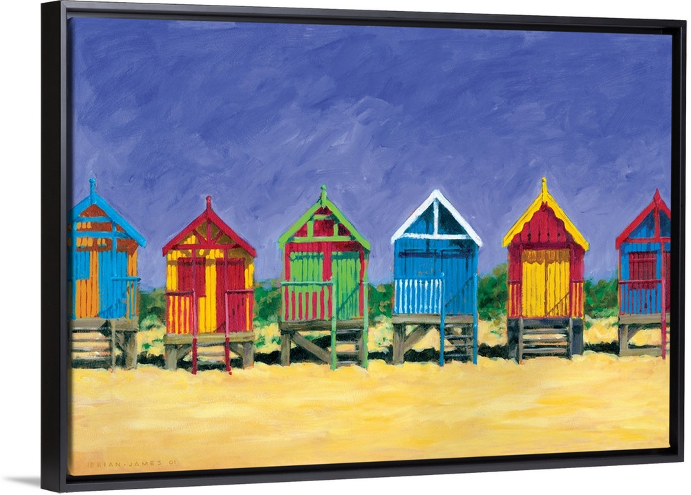 <p>Contemporary painting of colorful beach huts on a sandy golden beach.</p>