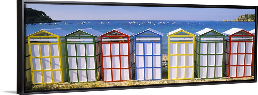 <p>Panoramic photograph of colorful row of huts on the shoreline with the ocean in the distance.</p>