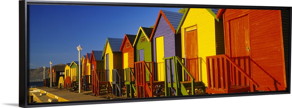 <p>Panoramic photograph displays a line of vibrantly colored seaside shacks on a sunny day. In the background there is a mountain making its way across the horizon.</p>