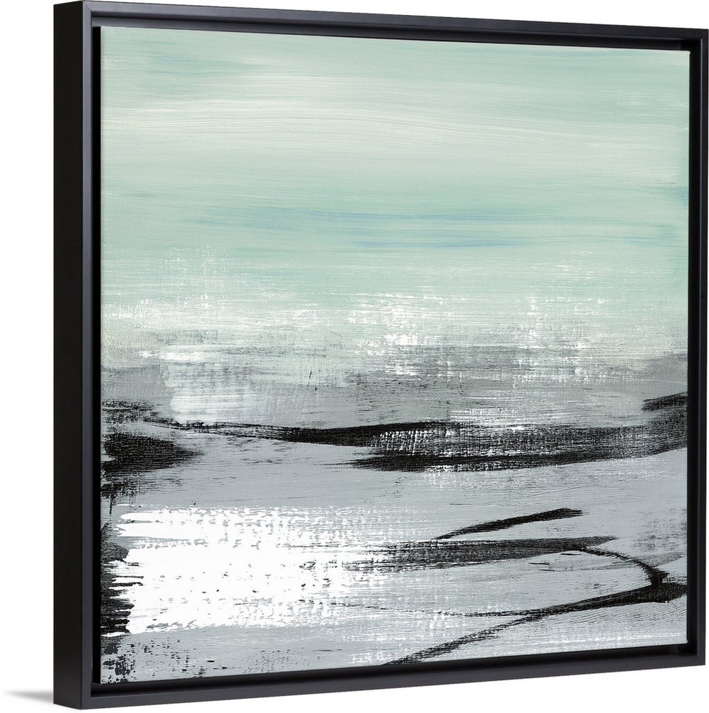 <p>A modern abstract landscape of a beach scene in bold brush strokes of black, gray and teal.</p>