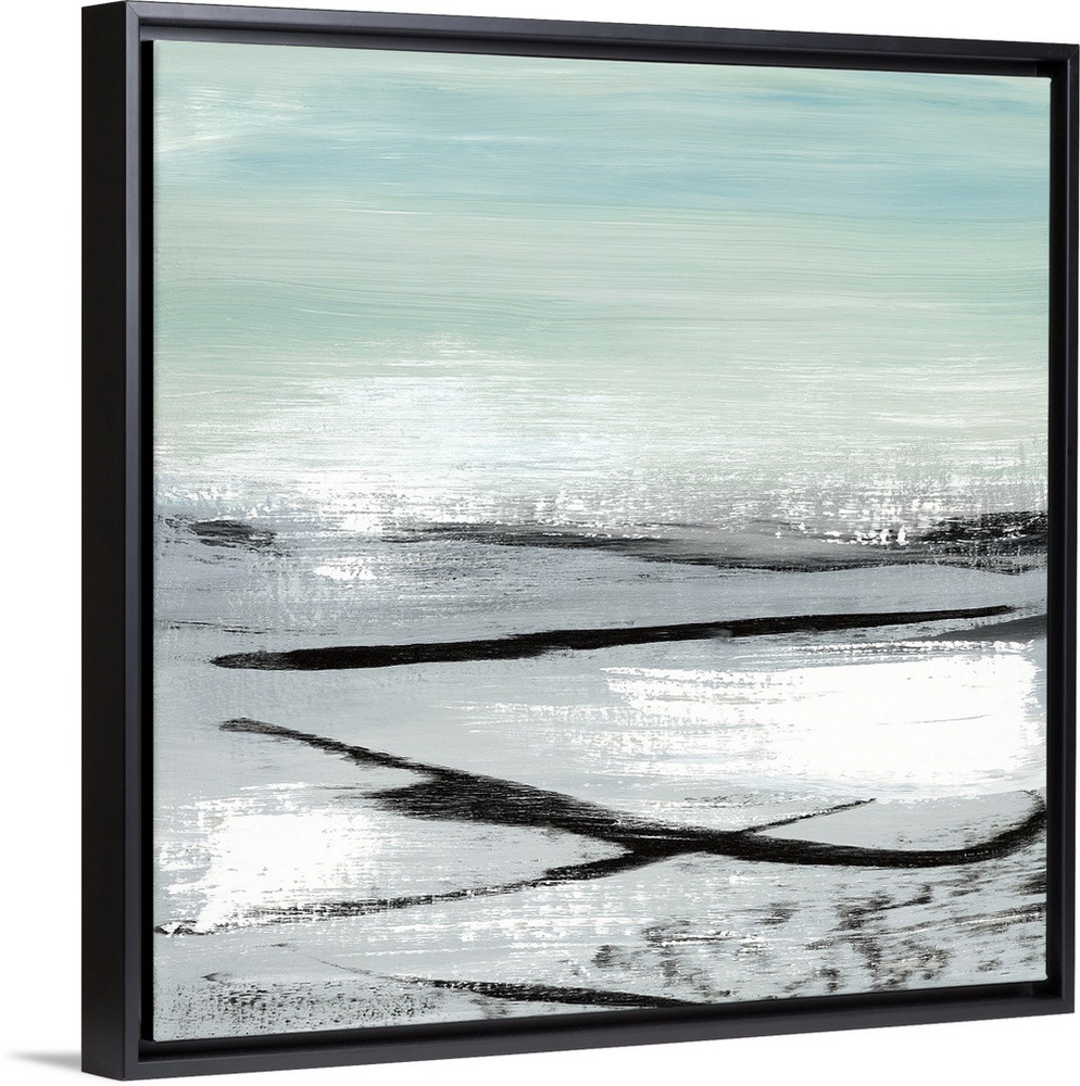 <p>A modern abstract landscape of a beach scene in bold brush strokes of black, gray and teal.</p>