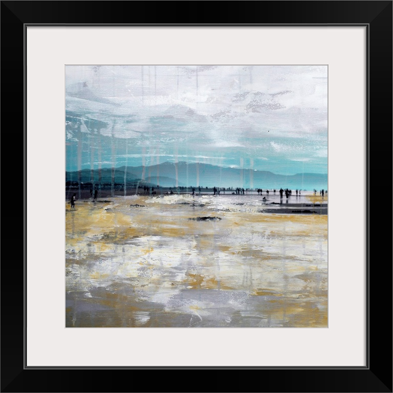 <p>Square mixed media artwork of people walking along a beach.</p>