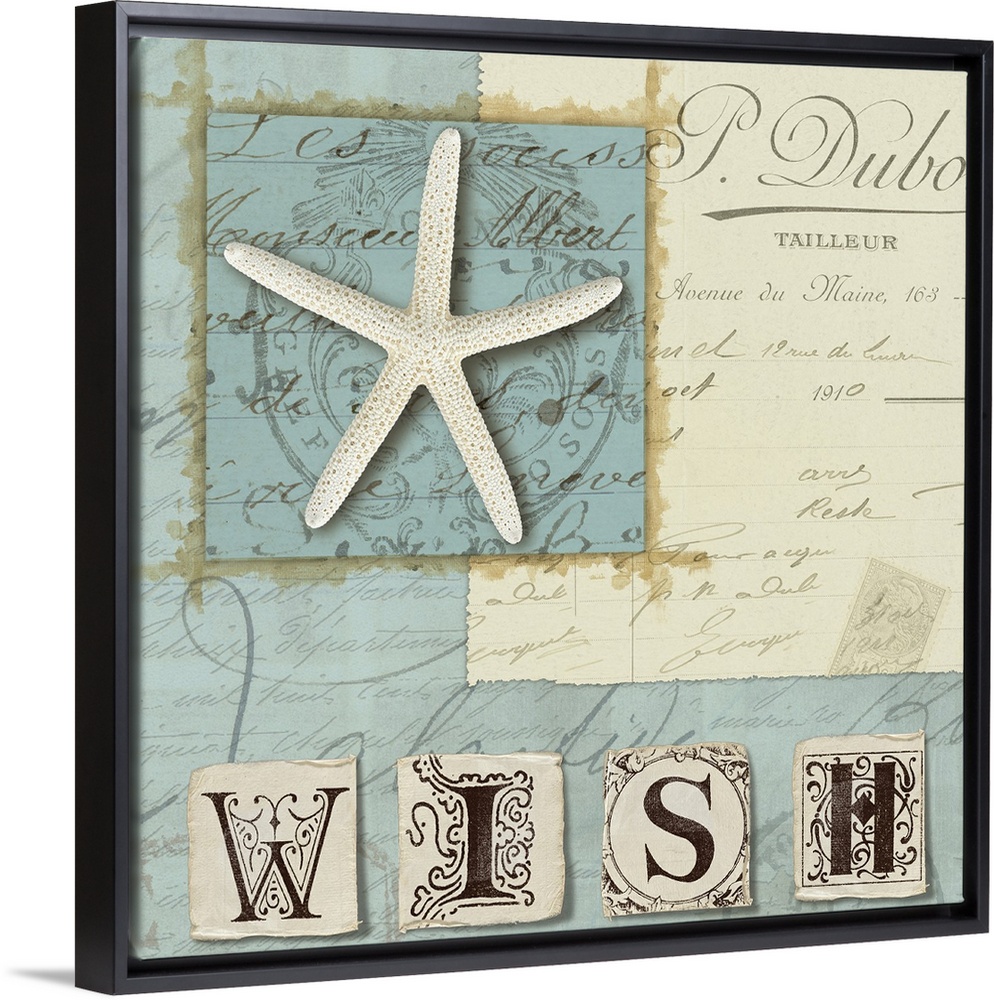 <p>This square shaped, decorative home docor accent is a wonderful piece to hang in a beach house, cottage, or bathroom. The artwork contains hand written text in French, collaged paper textures, a preserved star fish, and the word oWISHo in decorative type.</p>