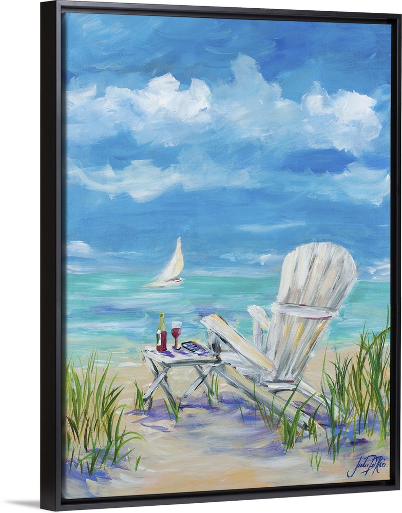 <p>Contemporary painting of a relaxing beach scene with a white beach chair and a table with red wine and a sailboat in the distance.</p>