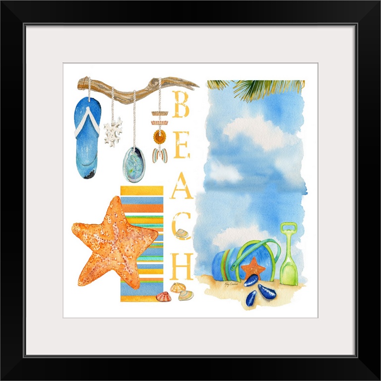<p>Watercolor painting with a collage of tropical beach necessities.</p>