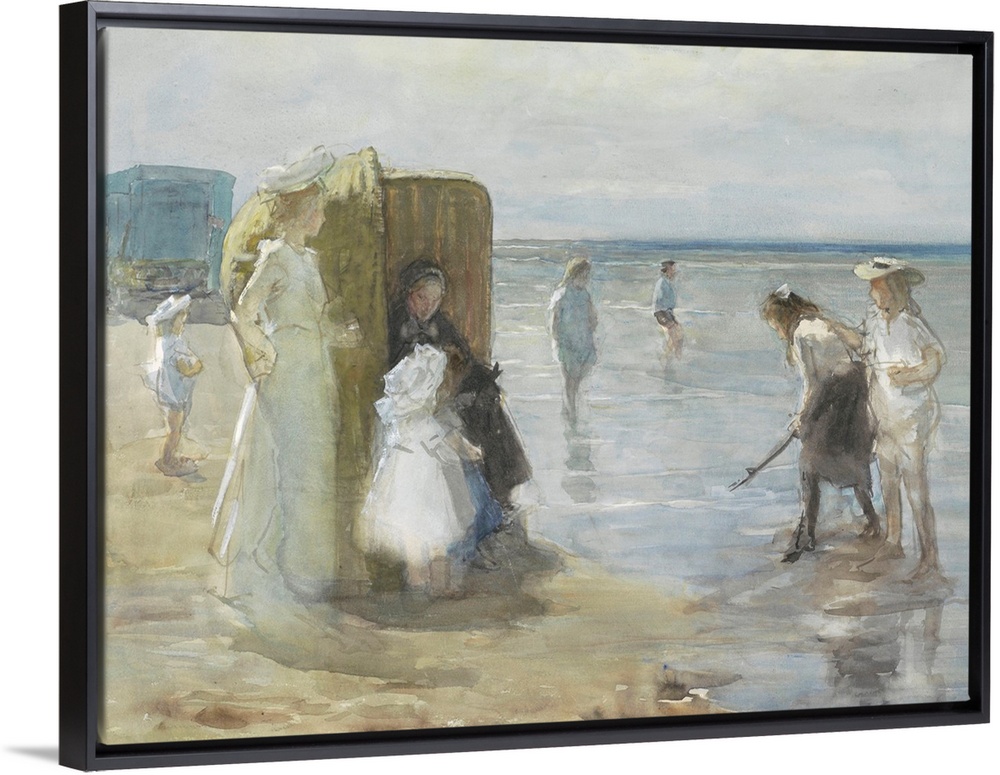 <p>Beach of Scheveningen, with Two Ladies and Children, by Johan Antonie de Jonge, c. 1890-1920. They are on the tide line with a large wicker beach chair. The young children stay close as bigger kids play on the beach. Dutch watercolor painting.</p>