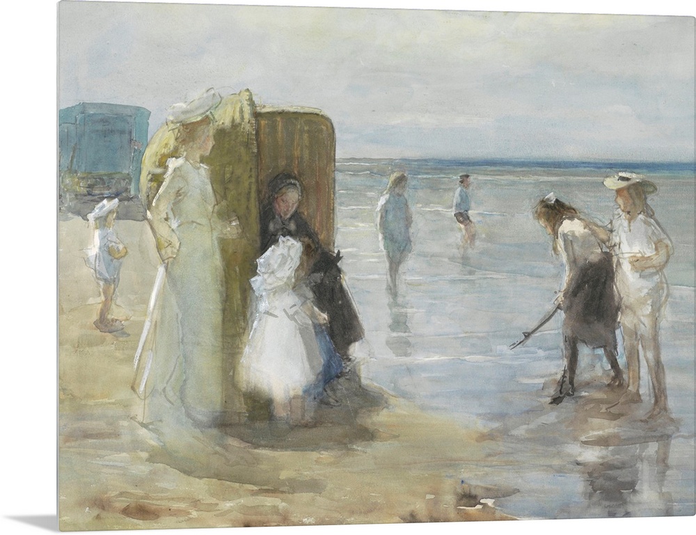 <p>Beach of Scheveningen, with Two Ladies and Children, by Johan Antonie de Jonge, c. 1890-1920. They are on the tide line with a large wicker beach chair. The young children stay close as bigger kids play on the beach. Dutch watercolor painting.</p>