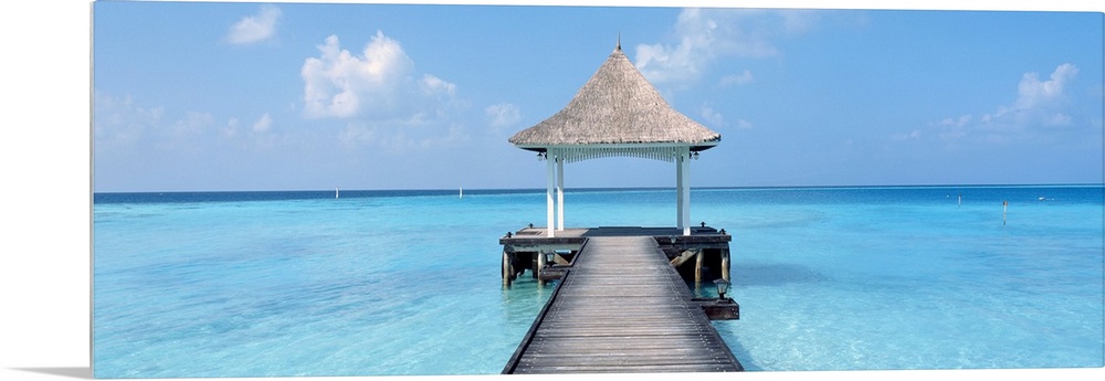 <p>Oversized panoramic photograph of a pier extending into the crystal clear waters of the Maldives, beneath a calming blue sky.</p>