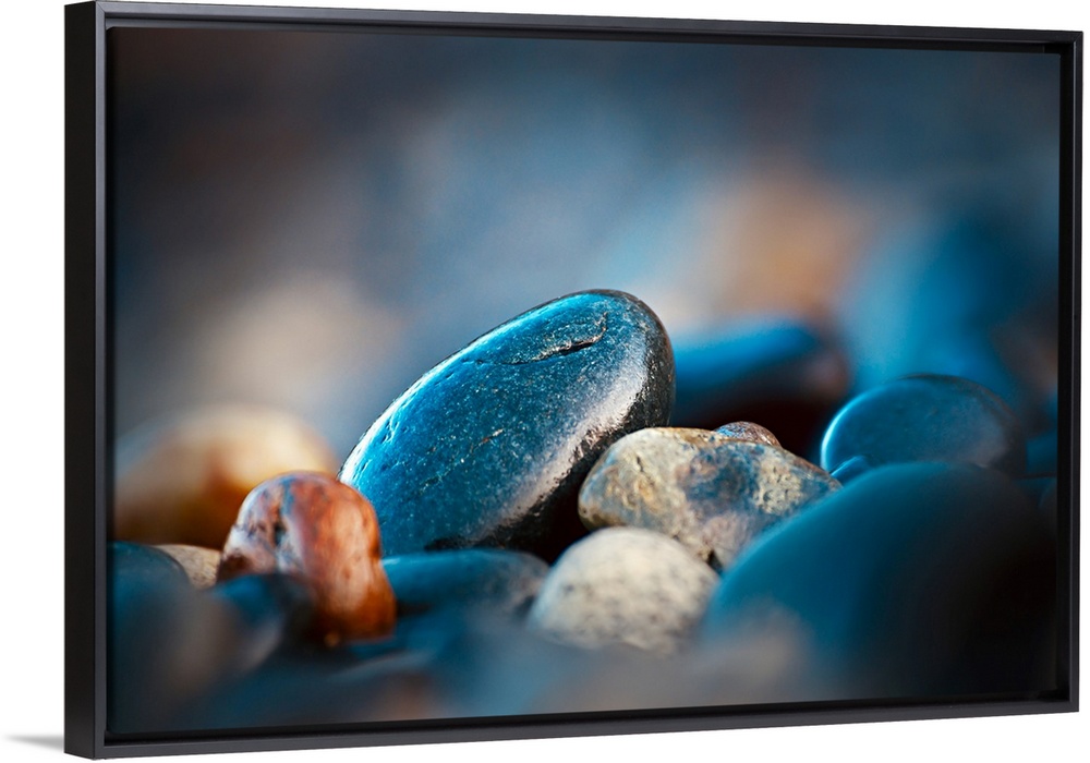 <p>Pebbles on a beach on Vancouver Island, British Columbia, Canada. The small rocks reflect the very early morning colours, gold, silvers and deep blues. The image is made at f/2.8 to keep just a section of the pebbles in focus, throwing both foreground and background into a very complementary blur.</p>