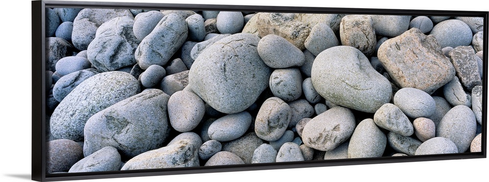 <p>Up-close panoramic photograph of seaside pebbles and rocks.</p>