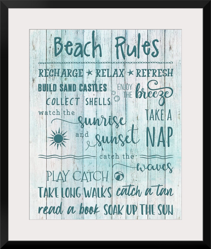 <p>"Beach Rules, Recharge, Relax, Refresh, Build Sand Castles, Collect Shells, Watch The Sunrise and Sunset, Take A Nap, Enjoy The Breeze, Catch The Waves, Play Catch, Take Long Walks, Catch a Tan, Read a Book, Soak Up The Sun"</p>