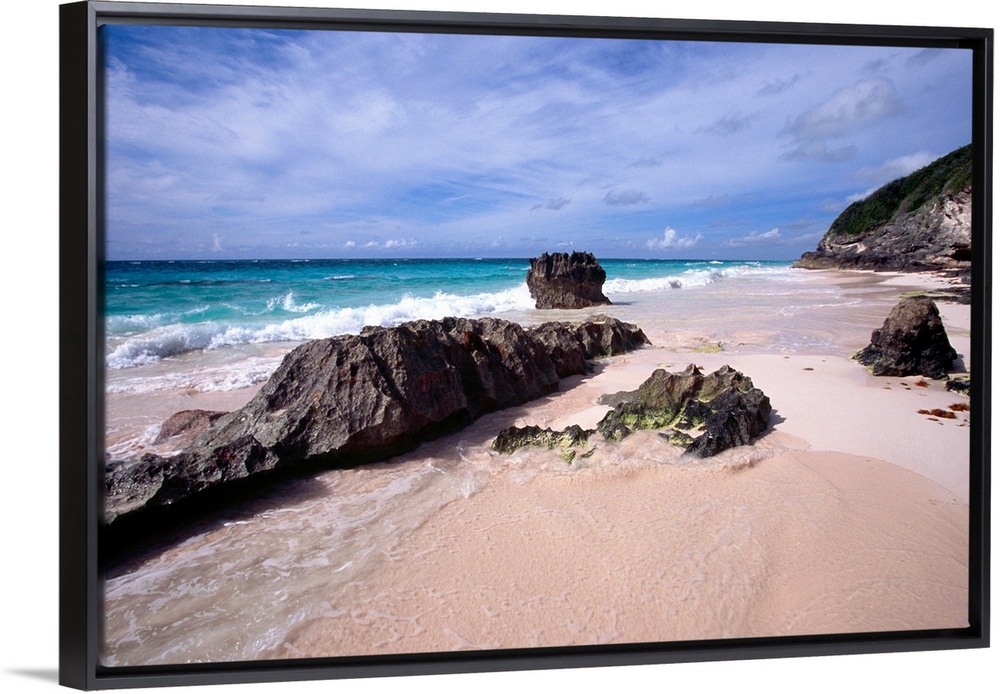 <p>View of a Pink Sand Shore, Elbow Beach, Bermuda, large rocks half-buried in the sand and foamy waves coming in from the ocean.</p>