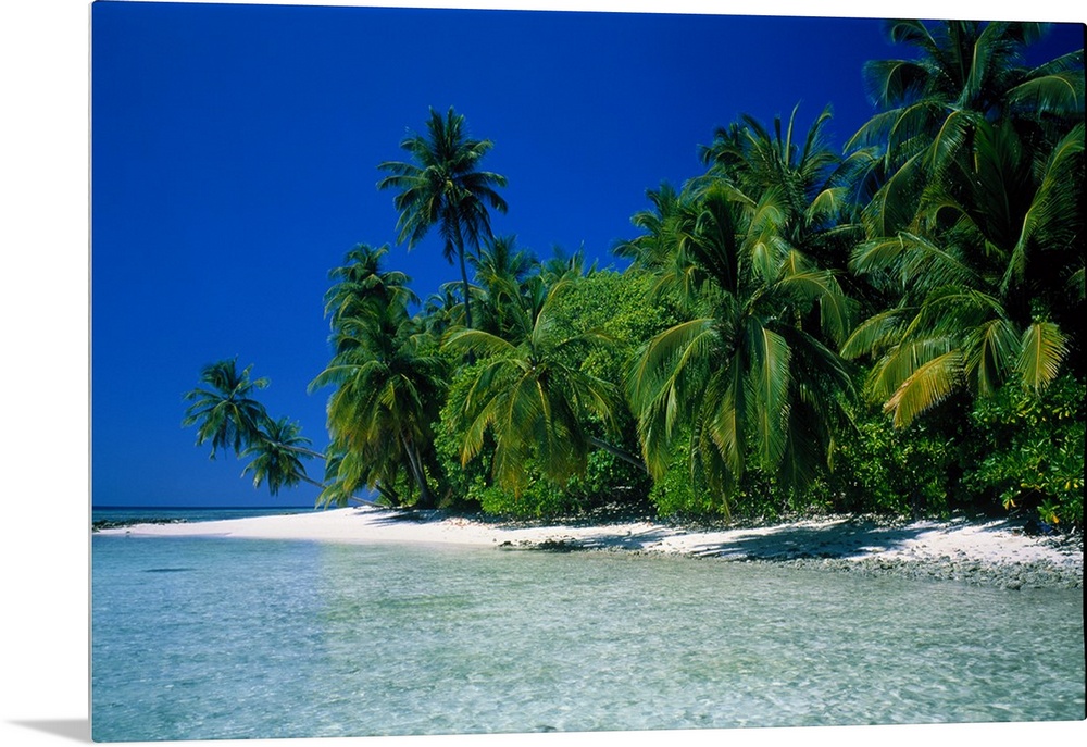 <p>Photographic print of a luscious forest of palm trees meeting a white sand beach with crystal clear ocean water.</p>