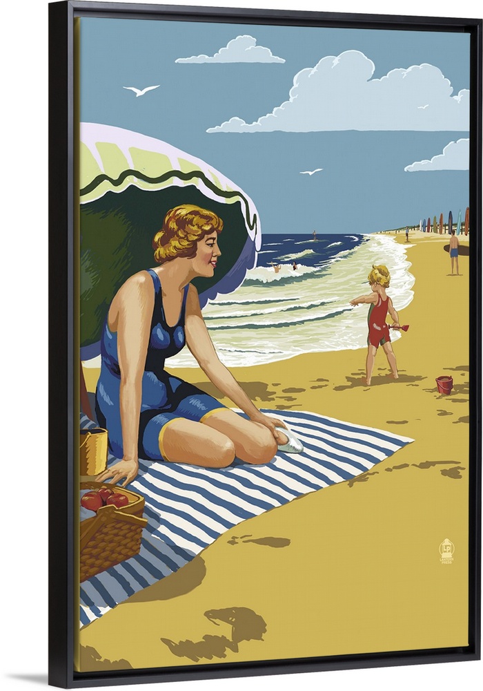 <p>Retro stylized art poster of a beach scene, with a woman sitting on a blanket under a an umbrella.</p>