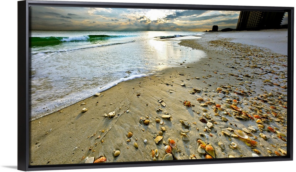 <p>A sandy shell covered shore before a bright sunset. A very tranquil and relaxing Florida vacation spot. Landscape taken on Navarre Beach. Florida.</p>