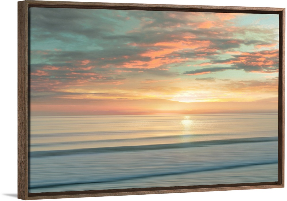 <p>A peaceful scene of the sun slowly rising over a calm stretch of ocean. The sky glows in shades of apricot and light teal. Transitional in style, the soothing nature of the image makes it perfect for a bedroom or bathroom.</p>